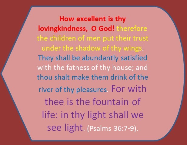 God Loves ME! I am kept SAFE under His Wings, SATISFIED with His Abundance, SATURATED from the “Rivers of His Pleasures”, and SHOWN THE WAY to ABUNDANT LIFE by His guidance- Glory!